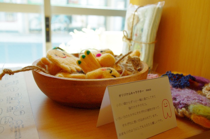 VIVACEの棚にあって一際目を引くキャラクター「モコ」をはじめとする羊毛フェルト雑貨たち。