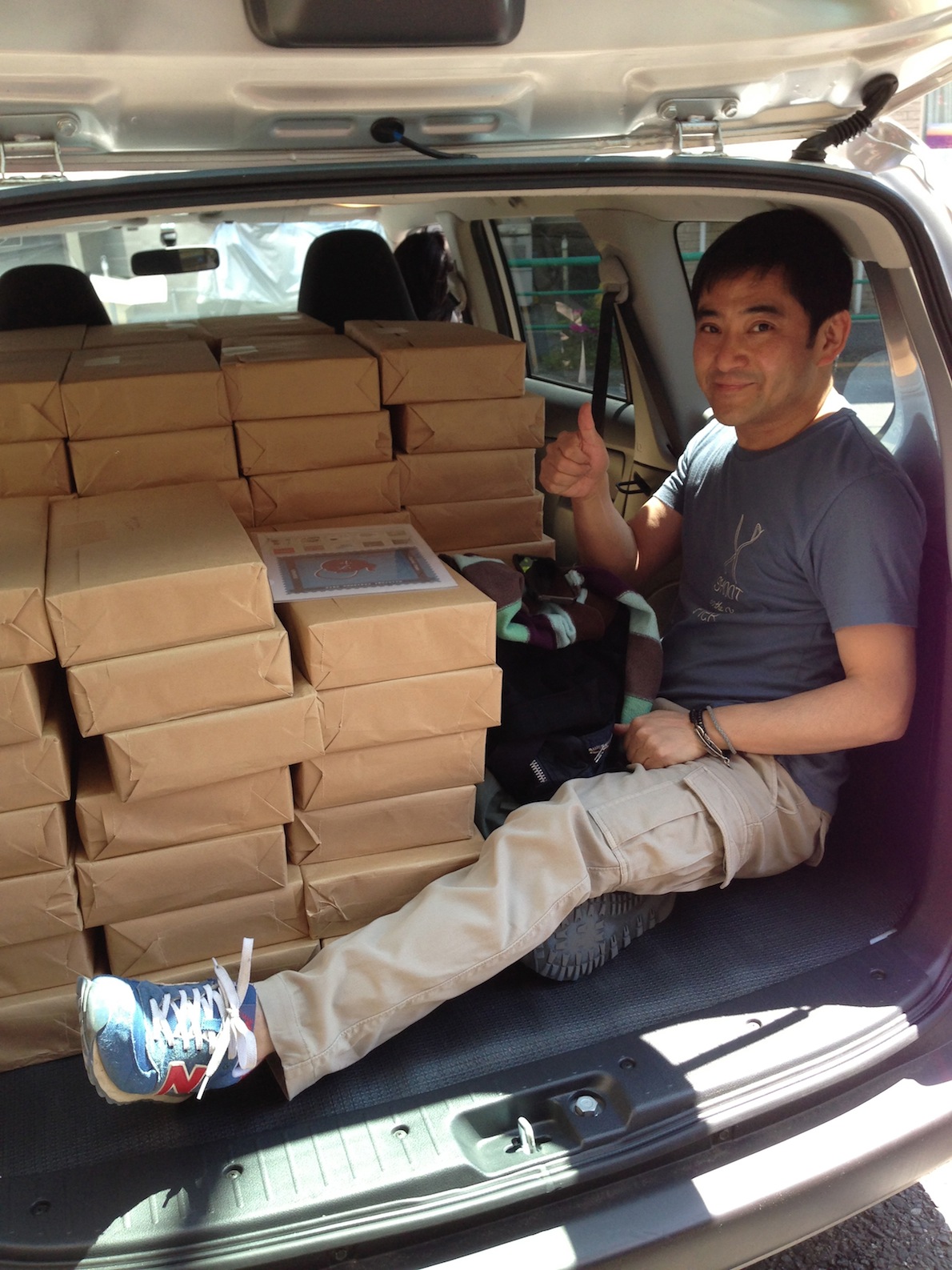 再度車(サイドカーとは読まない)に乗せて各参加店へ配布。あまりの重さに車高が低くなったとかならなかったとか。