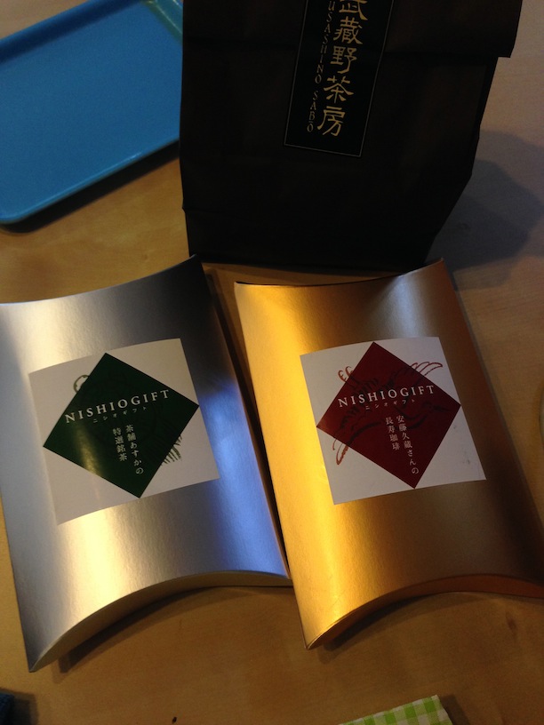 お客さんからお祝いとして「ニシオギフト」をいただきました。(別の方にたまたまいただいた武蔵野茶房のレーズンサンドも映っています)